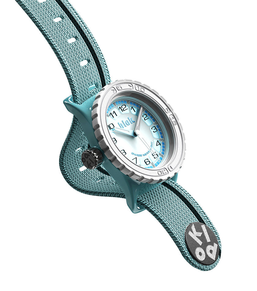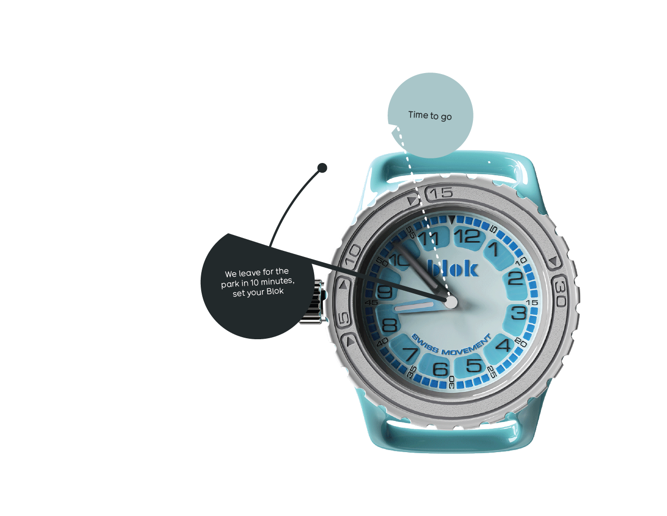 The Blok 33 introduces our unique analog time management system. A rotating bezel carries 4 simple time “bloks” that allow a kid to have a clear visual understanding of time passing.