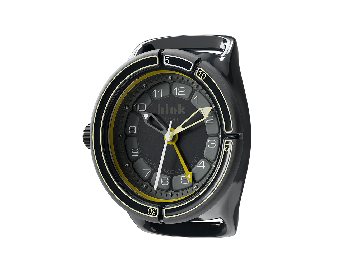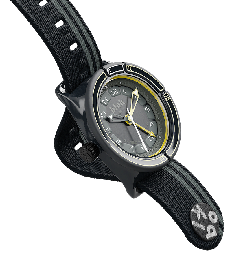The Blok 38 features our unique analog time management system. A rotating bezel carries 4 simple time “bloks” that allow a clear visual understanding of time passing.